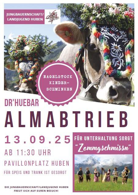 Am Samstag, 13.09.2025 findet beim Pavillon Huben der Almabtrieb statt. Die Gruppe "Zommgschmissen" sorgt für eine gute Stimmung bei guten Essen und kalten Getränken.
