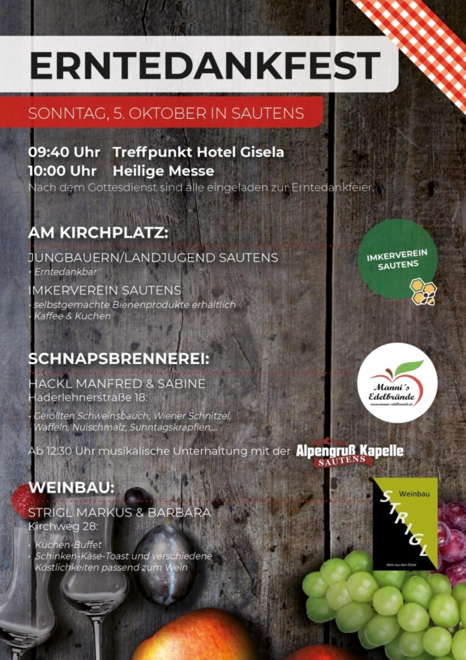 - Kulinarische Schmankerln wie gerollter Schweinsbauch, Wiener Schnitzel, Waffeln, Nußschmalz und Sonntagskrapflen - Ab 12:30 Uhr sorgt die Alpengruß Kapelle Sautens für musikalische Unterhaltung