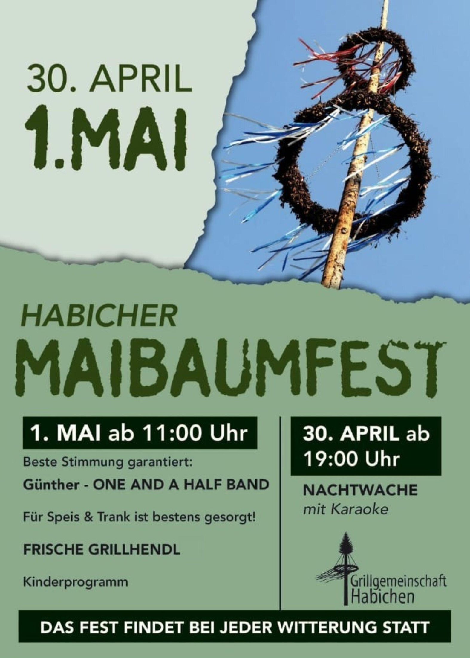 Am 1. Mai lädt die Grillgemeinschaft Habichen herzlich zum traditionellen Habicher Maibaumfest ein. Los geht’s bereits am 30. April ab 19:00 Uhr mit der stimmungsvollen Nachtwache inklusive Karaoke – der perfekte Auftakt in den Mai.