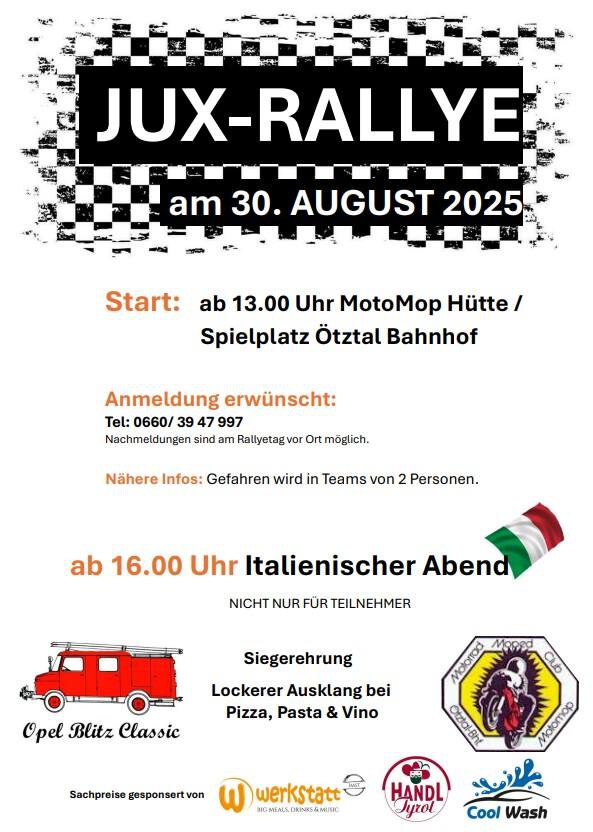 Ab 13 Uhr startet die JUX-Rallye bei der MotoMop Hütte am Spielplatz – gefahren wird in Zweierteams, und auch spontane Teilnehmer können sich noch am Veranstaltungstag anmelden.