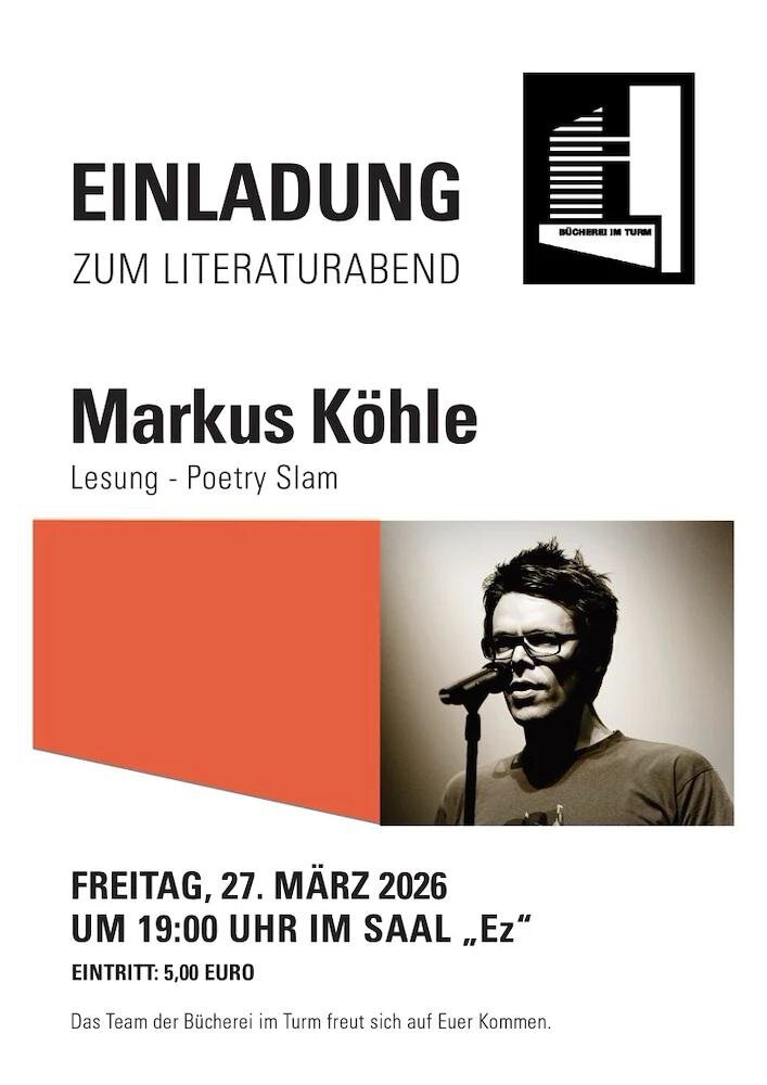 Die Bücherei im Turm lädt zu einem besonderen Literaturabend mit dem bekannten Tiroler Autor und Poetry-Slammer Markus Köhle ein. Freut euch auf eine unterhaltsame Lesung voller Wortwitz, Sprachkunst und überraschender Gedanken.