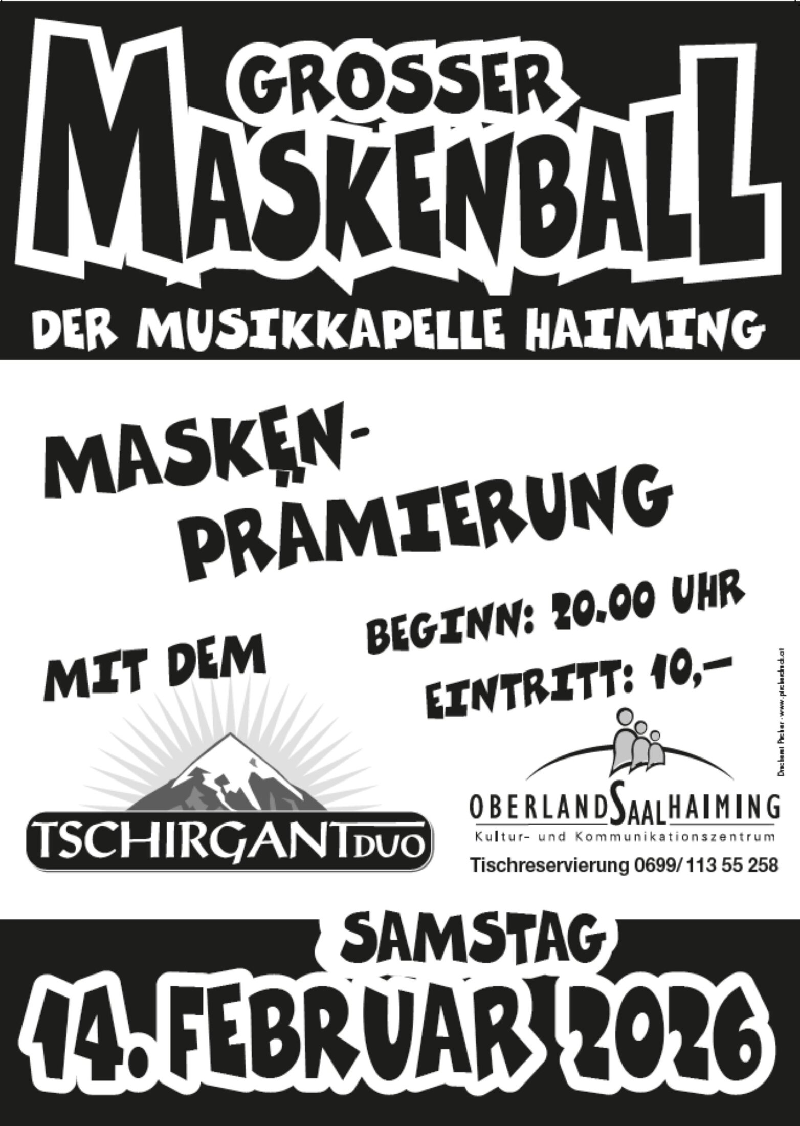 Am Samstag, 14. Februar 2026, lädt die Musikkapelle Haiming zum Großen Maskenball in den Oberlandsaal Haiming ein. Freuen Sie sich auf eine stimmungsvolle Ballnacht mit Maskenprämierung und Live-Musik vom Tschirgant Duo. Beginn ist um 20.00 Uhr, der Eintritt beträgt 10,- Euro