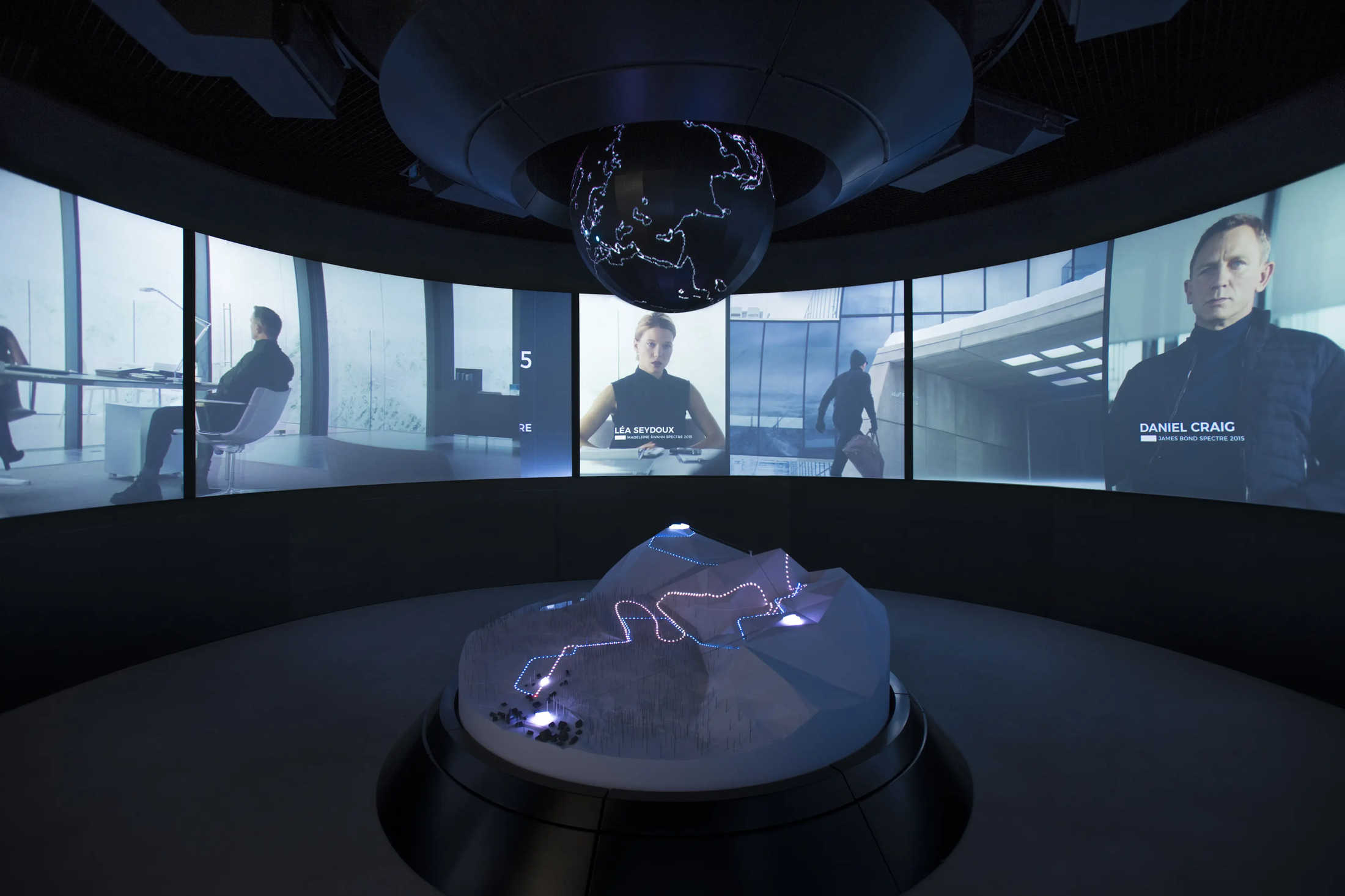 Begrüßt wird man in Raum 1 von Regisseur Sam Mendes, der von seiner Sölden-Zeit erzählt und die filmerischen Hintergründe erläutert. Behind-the-Scenes Informationen über die Entstehung der Bond-Welten tauchen auch in den folgenden Räumen immer wieder auf. Man erfährt Skurriles zu den Dreharbeiten, zu den immensen Dimensionen der Umsetzung und der visionären Radikalität von Produzent Broccoli und Production Designer Sir Ken Adam.