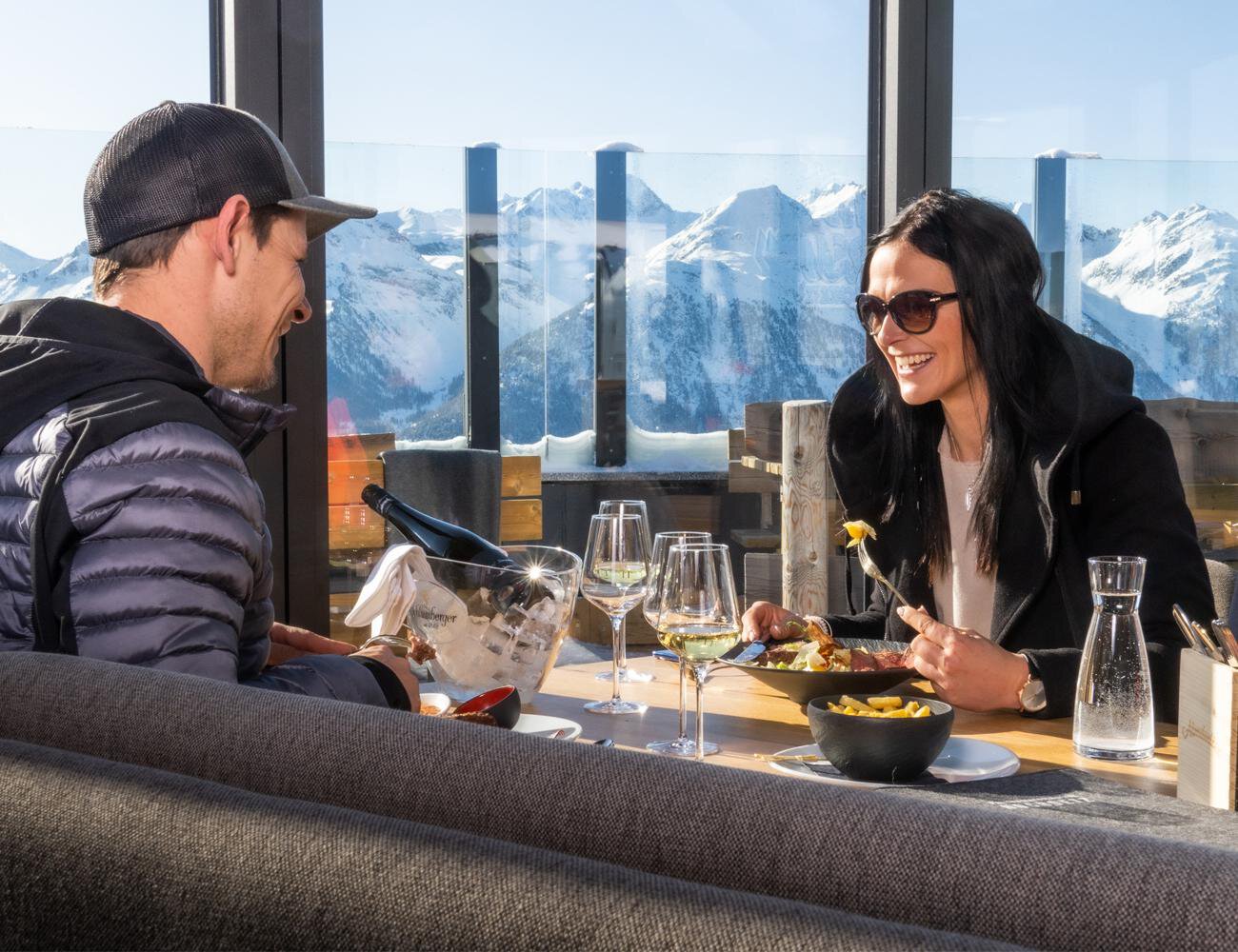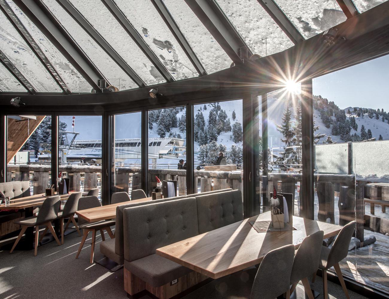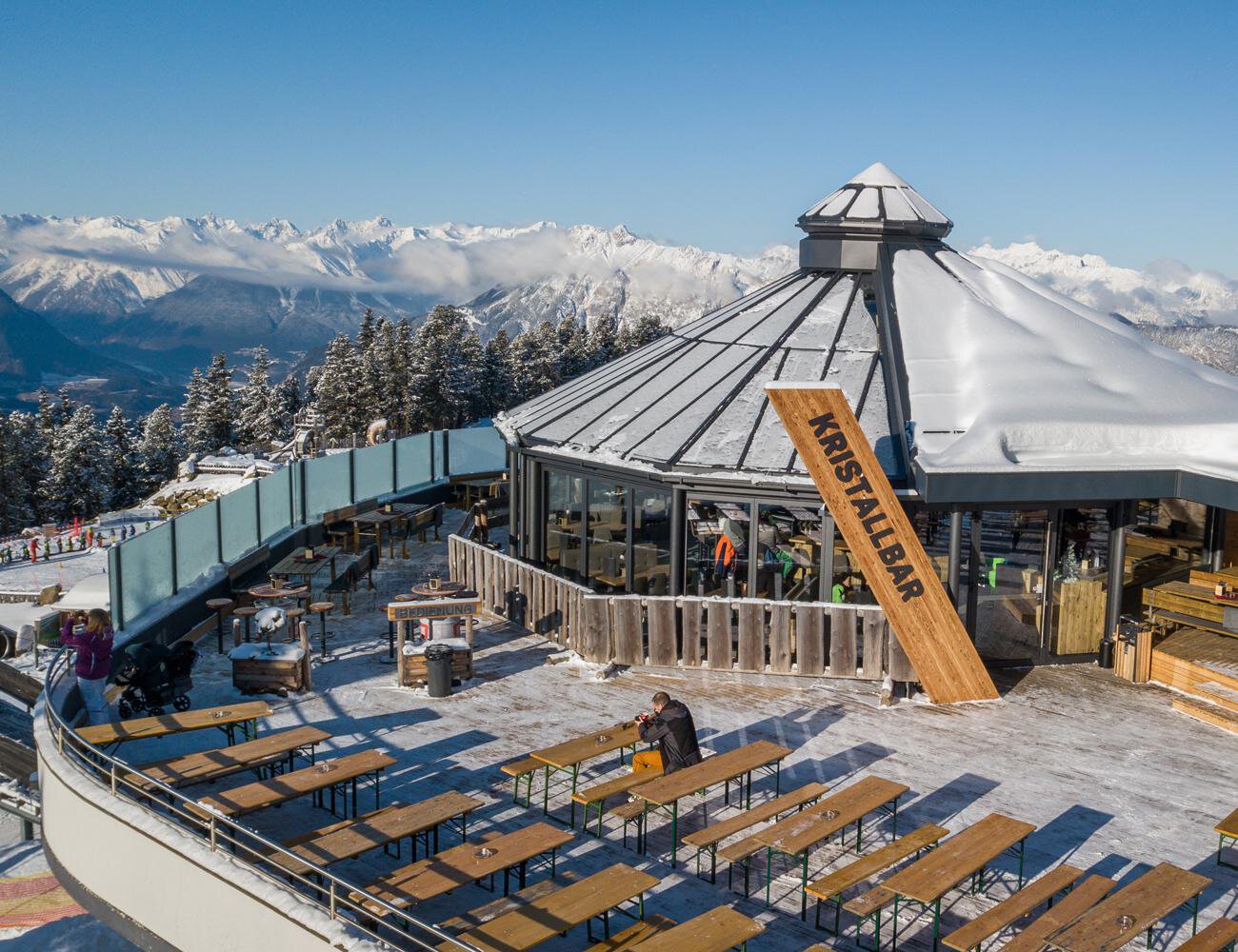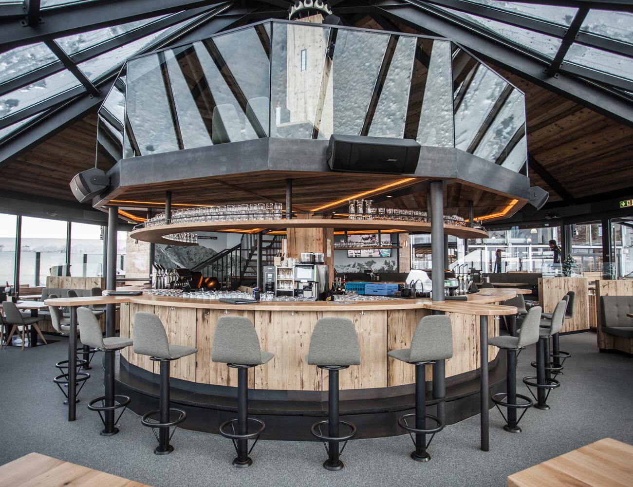 Die Kristallbar thront als eigenes Stockwerk hoch auf der Terrasse des Panoramarestaurants Hochoetz. Bei freiem Blick auf die Ötztaler Bergwelt lassen sich Genießer in stilvollem Ambiente verwöhnen.