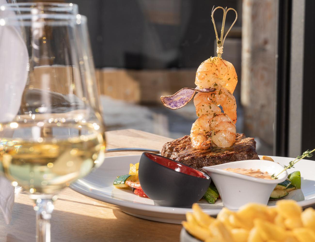 Hochwertiges Altholz in Verbindung mit modernen Materialien prägt den Charakter des Bedienungsrestaurants mit Galerie und angeschlossenem Lounge-Bereich. Bei sommerlichen Temperaturen lassen sich sowohl das Dach als auch die Fensterteile halbseitig öffnen. Zusätzliche Sitzplätze im Freien laden zum Sonnenanbeten mit Aussicht. Die integrierte Outdoorbühne bietet eine ideale Plattform für das vielseitige Unterhaltungsprogramm im Schigebiet Hochoetz.