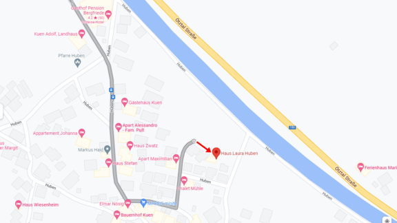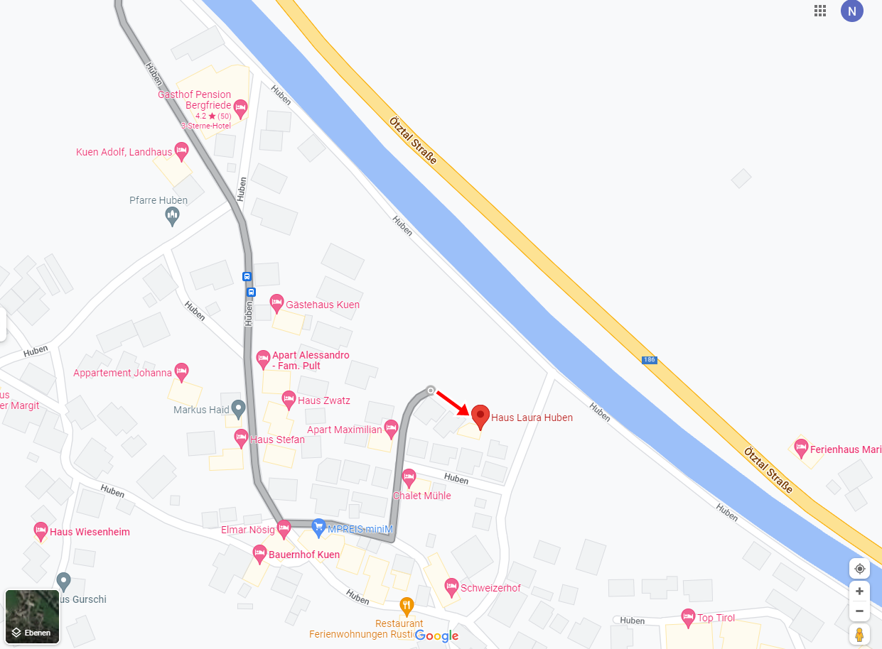 Unser Haus Laura am Ortsrand von Huben, Einkaufsmöglichkeiten im Ortszentrum in ca. 300 m, Restaurants in ca. 500 m und die Loipe in ca. 300 m Entfernung. Die ca. 500 m entfernte Skibus-Haltestelle bringt sie kostenlos zu den Skigebieten in Sölden (Entfernung ca. 10 km). Die Tirol-Therme Längenfeld ist ca. 3,5 km entfernt. Im Sommer erhalten unsere Gäste die Summer Card.