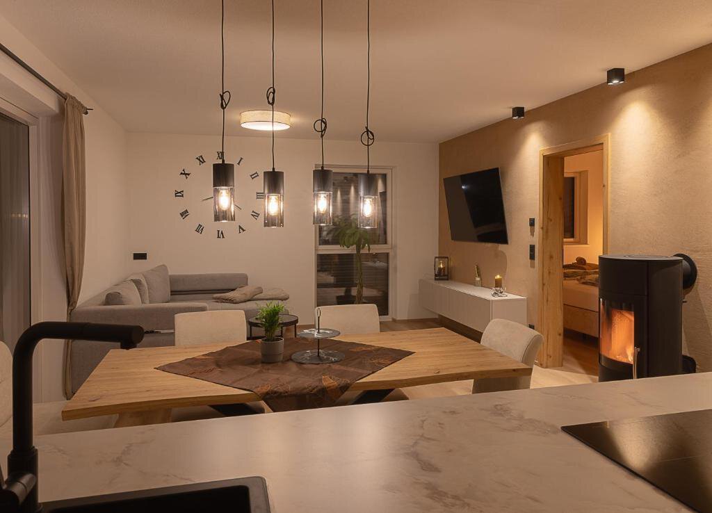 Ein besonderes Highlight der Unterkunft ist die großzügige, überdachte Süd-West-Terrasse mit traumhaftem Bergpanorama – perfekt für sonnige Stunden und entspannte Abende. Der hochwertige Heizkamin im Wohnbereich sorgt zusätzlich für eine gemütliche Atmosphäre.