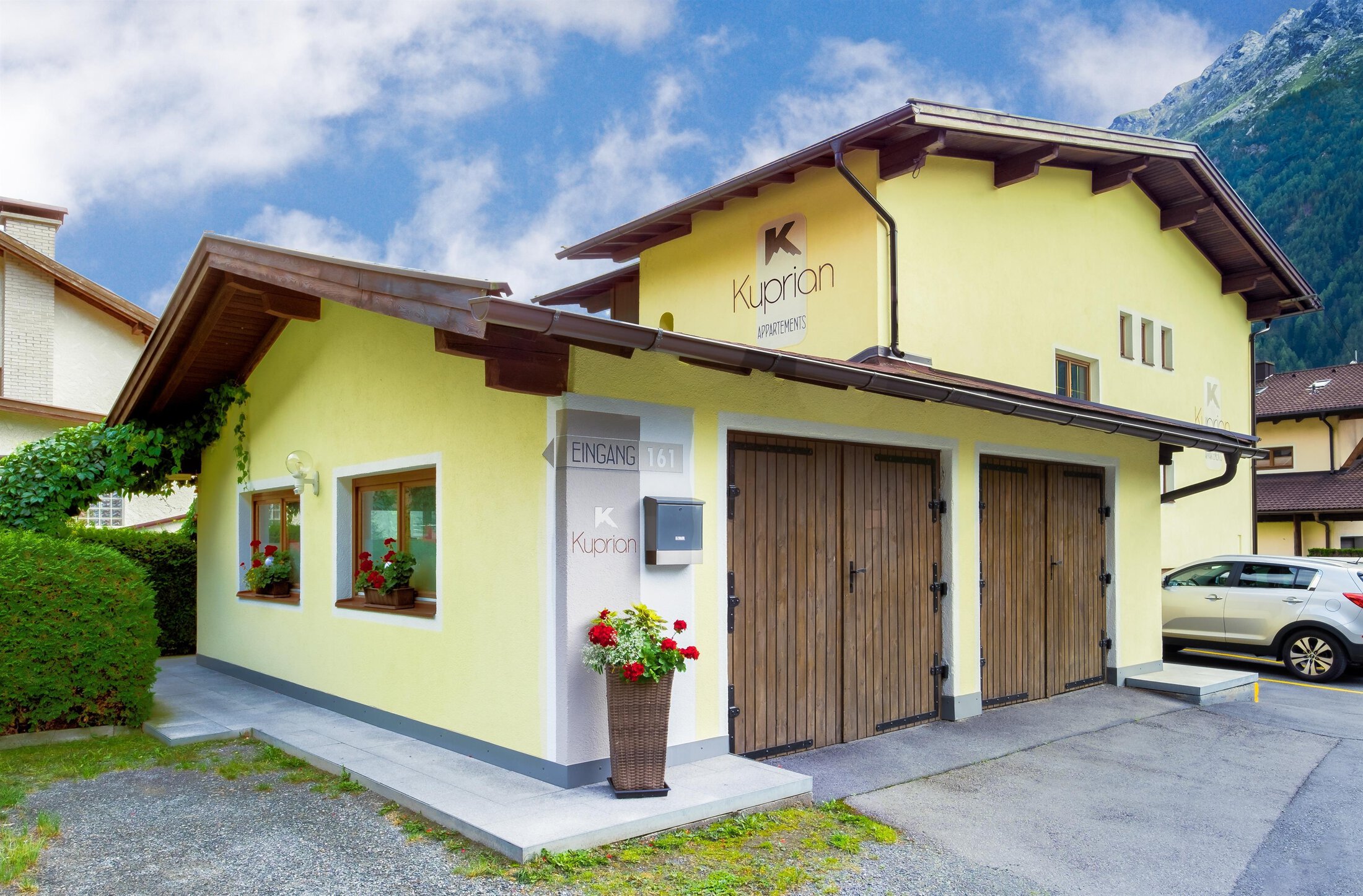 Anreise: Am Ortsanfang von Längenfeld, genau gegenüber dem Blumengeschäft rechts einbiegen und der Hinweistafel "App.Kuprian" folgen. Unser Haus ist das dritte auf der linken Seite mit der Nr.161, Eingang um die Ecke