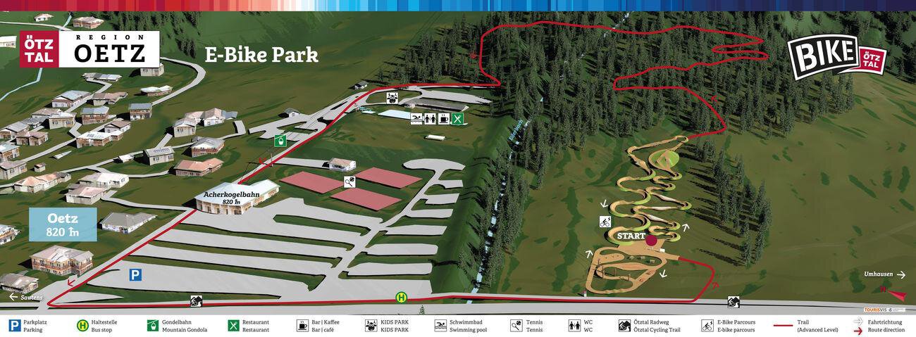 It is the first of its kind in Tirol, equipped with an uphill flow area: the new eBIKE PARK in Oetz comprises several routes of varying difficulty just perfect to get in touch with e-biking for the very first time. On wavy tracks with different trail surfaces you will get the right feeling for your bike, its mechanics and off-road behavior. The course covers 1.5 kilometers: Beginners start with the easy, blue route similar to the ski slopes in winter. It won't take long until you feel safe enough for the more difficult Sattelfest practice trail.
