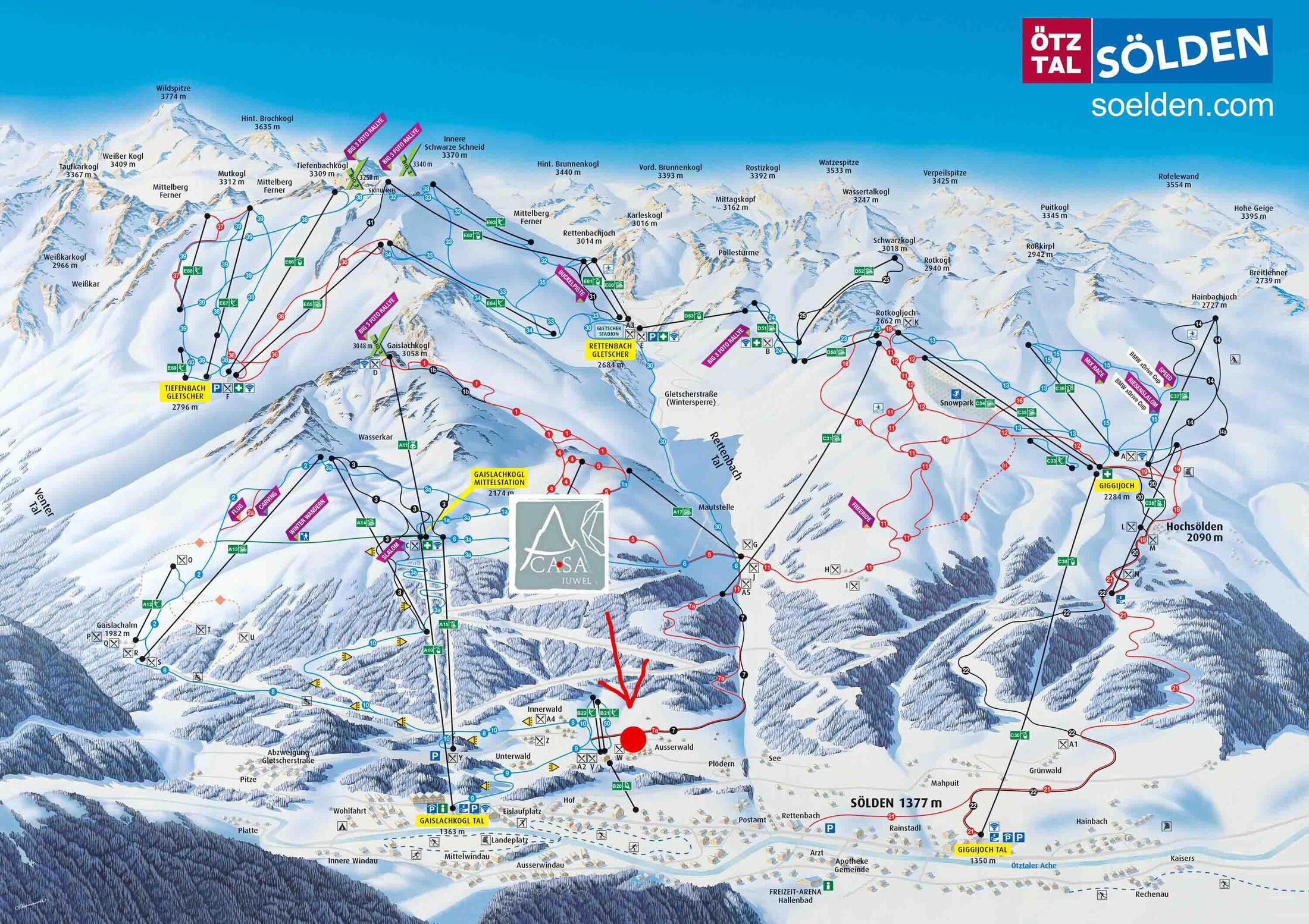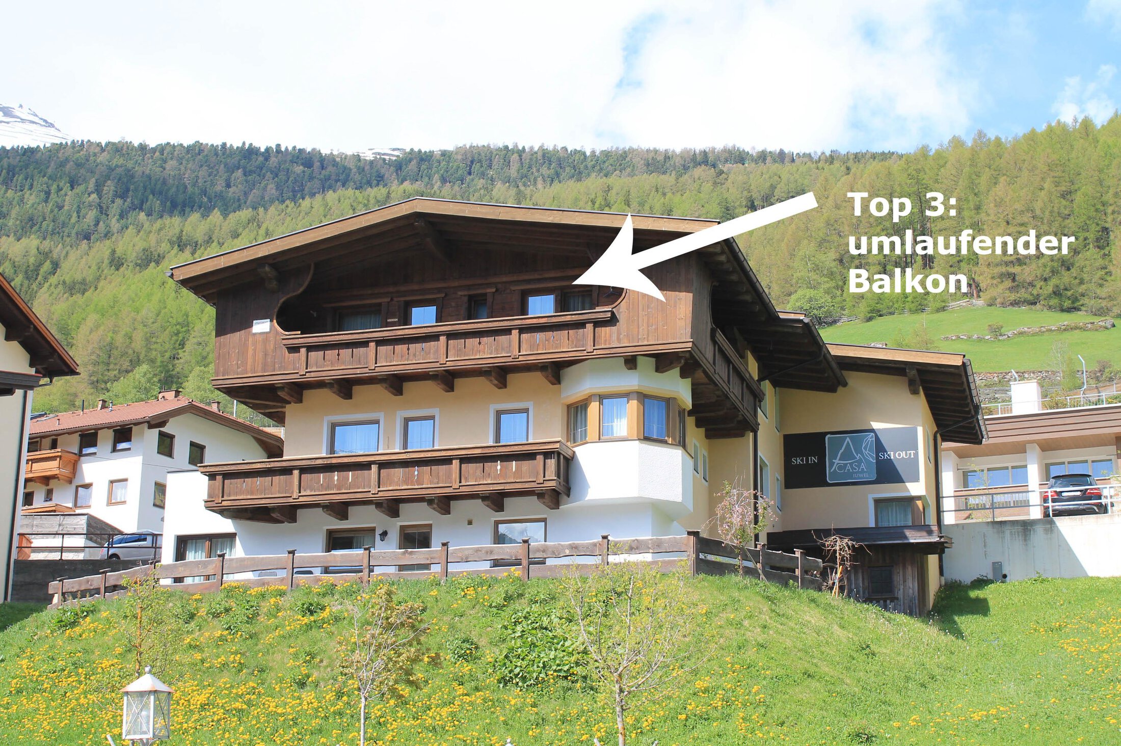 Directions: through th evillag ecenter of Sölden, then turn right at the BP gas station - follow the brown signs to "AUSSERWALD" and the green signs "JUWEL".