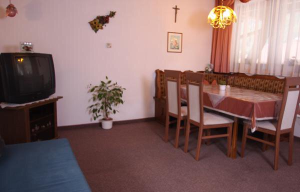 The 3-room apartment (80 m²) for 6 people is located on the 1st floor: 2 bedrooms (1 double room, 1 double room with a single bed), living/sleeping area with sofa bed, dining area for 8 people, kitchenette (4 hot plates, oven, dishwasher, coffee maker, kettle, toaster). Bathroom with shower, separate toilet. South-facing balcony. The apartment is fully equipped (towels, bed linen, kitchen utensils) and has satellite TV and internet access (W-LAN, exclusive). The bedrooms were completely renovated in 2011.