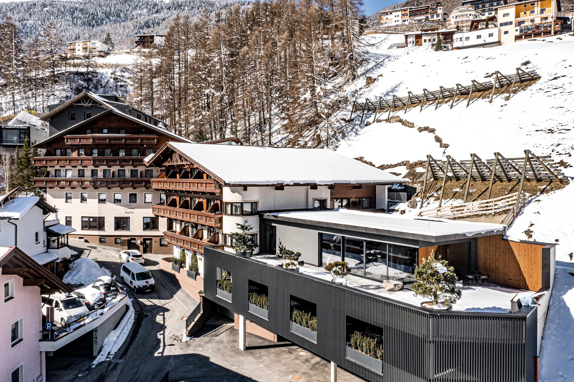 Scenic 4 Star Hotel Alpina is situated in a hillside location only one row of houses above the village center of Sölden, boasting gorgeous panoramic views. Ideal for sporty guests. You reach the ski area within no time: free shuttle buses ( 1.12. unitl 10.04.) take you to the mountain lifts in the morning (Giggijoch base station). The top-to-bottom ski run runs past our hotel.