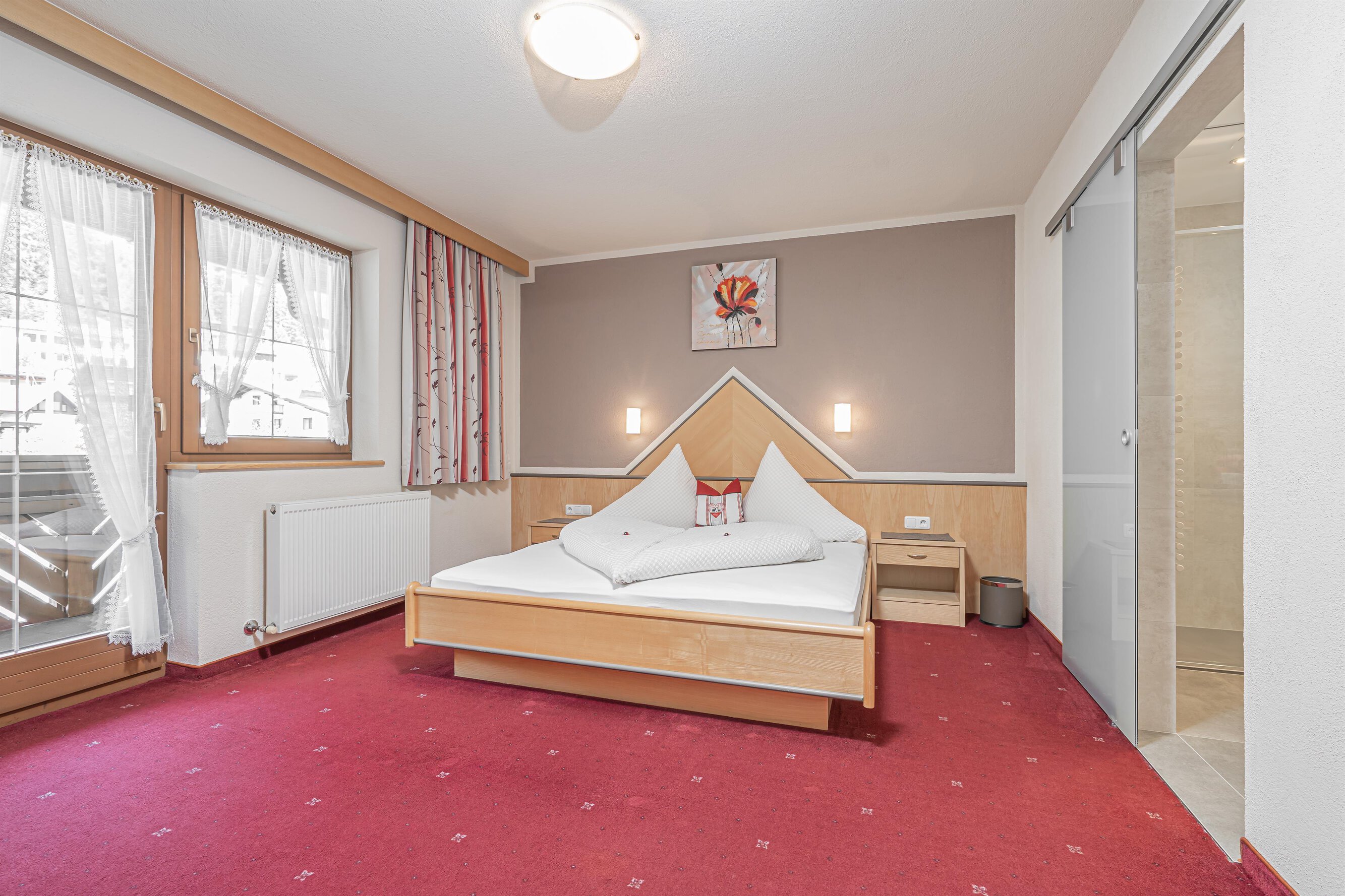 Experience the loveliest days of the year at the stylishly furnished "Vierjahreszeiten" family-run guesthouse, awarded 4 Edelweiss. Hospitable, comfortable and with uninterrupted panoramic views of the fascinating Ötztal mountain world: experience a truly unforgettable vacation! Personally welcomed and culinary spoiled for breakfast by Carola Jenewein. You will feel at ease: "Here I have discovered a special place for me!" Central yet quiet right in the village center. Skibus stop at just 1 walking minute, mountain gondolas at about 7 minutes, center shuttle at 2 minutes. Sports shops, restaurants, bakery, grocery stores can be found in the immediate vicinity. Ample parking available.
